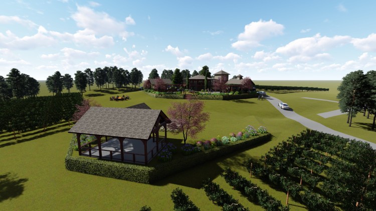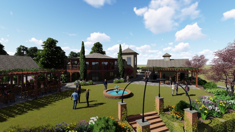 Vickie and Jonathan share a grand vision for Mountain Brook Vineyards. Striving to develop a destination winery, building upon the existing family friendly feel by creating beautifully manicured grounds offering numerous options for outside enjoyment of their wine. The existing round tasting room is the center feature of the below concept design. The upstairs space will continue to serve as the tasting room and the outdoor patio wrapping around the building will remain for guest to sit and enjoy the gorgeous views. The downstairs will be utilized as the winery’s retail gift shop. A beautiful grass lawn with a centerpiece fountain will be flanked on each side by shaded pergola canopies. A wedding pavilion will be constructed, and the winery production facility will be expanded. The winery facility will include a classroom allowing for opportunities to teach and learn about the art and science of winemaking, from vine to bottle.