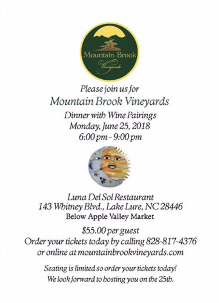 Here’s to hoping for continuing dinner with wine pairings from Mountain Brook Vineyards and Luna del Sol. When visiting either, trust your GPS. A fun time was certainly enjoyed by all. Here’s to all the staff of Luna del Sol and also everyone from Mountain Brook Vineyards. Congratulations, your first wine dinner pairing was a resounding success. Cheers!