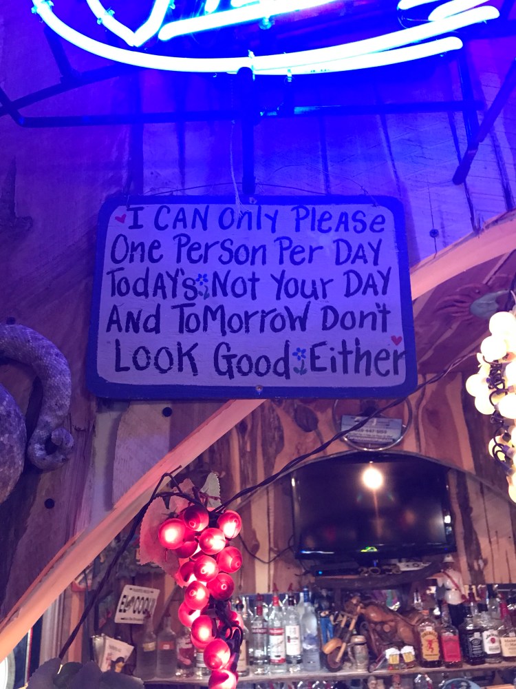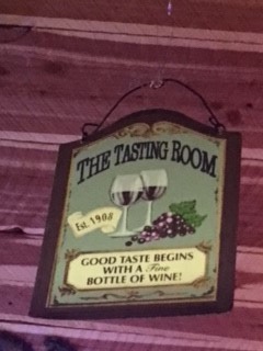 Monday night Dennis and I were privileged to get to attend Mountain Brook Vineyards’ first wine dinner with the new owners, Vickie and Jonathan Redgrave. They selected Luna del Sol in Lake Lure as the restaurant venue. This is the most quaint and fun hidden gem I believe in Lake Lure. We were supposed to start out on the beautiful patio but Mother Nature had other plans so the pre-appetizers were moved inside to their “oh so cute” bar area along with the lovely song stylings of Bren Sams. They have some of the funniest signs all over the bar area. Below is a picture of just one of my favorites.