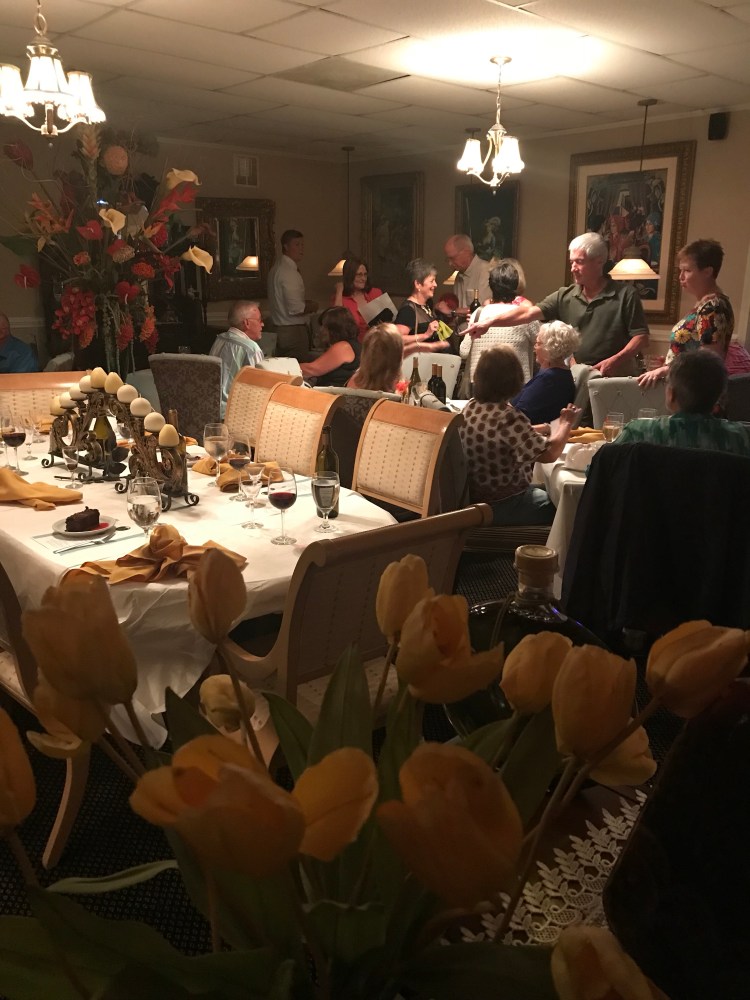 We enjoyed a wonderful peach sangria that Vickie made and then a sampling of their Pinot Grigio with some Bruschetta. There was also a lovely salmon with capers but as I am not much of a salmon fan, we relied on the many other guest whom enjoyed the salmon and proclaimed it was very good. We guesstimated a crowd of about forty joined us in enjoying this fabulous dinner with wine pairing.