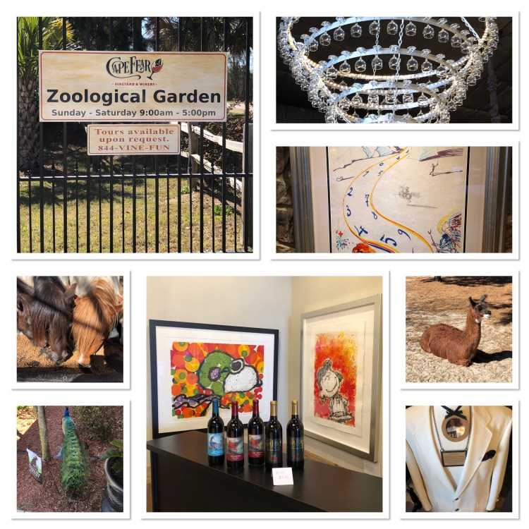 The next day we headed over to Cape Fear Winery. The property is beautiful, they have a restaurant (that we didn’t know about until we got there) and they have some really great wines, 2 really great red blends.. The owner is also an art and memorabilia collector. They are also kid friendly as they have a mini petting zoo. There are 2 beautiful male peacocks (we were told that the female went missing after the last hurricane), several other birds, ducks, donkeys, miniature horses, swans, bunnies, llamas, a cow, and a wallaby (who lives with the wine maker and was not there the day we were).