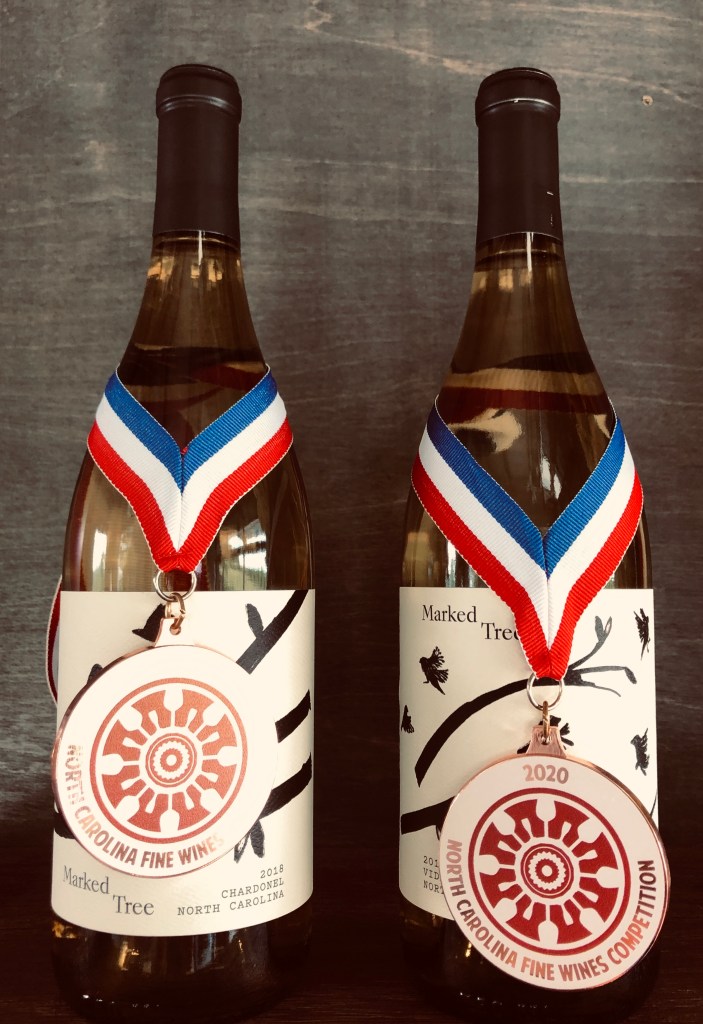 First bottling was in 2019 and encouraged by their winemaker, the 2018 Vidal Blanc and 2018 Chardonel were entered in the 2020 NC Fine Wines competition. Lance and Tim were thrilled to win two bronze medals with these young wines. No doubt as these vines mature, there’s going to be many gold medals won by Marked Tree Vineyard!