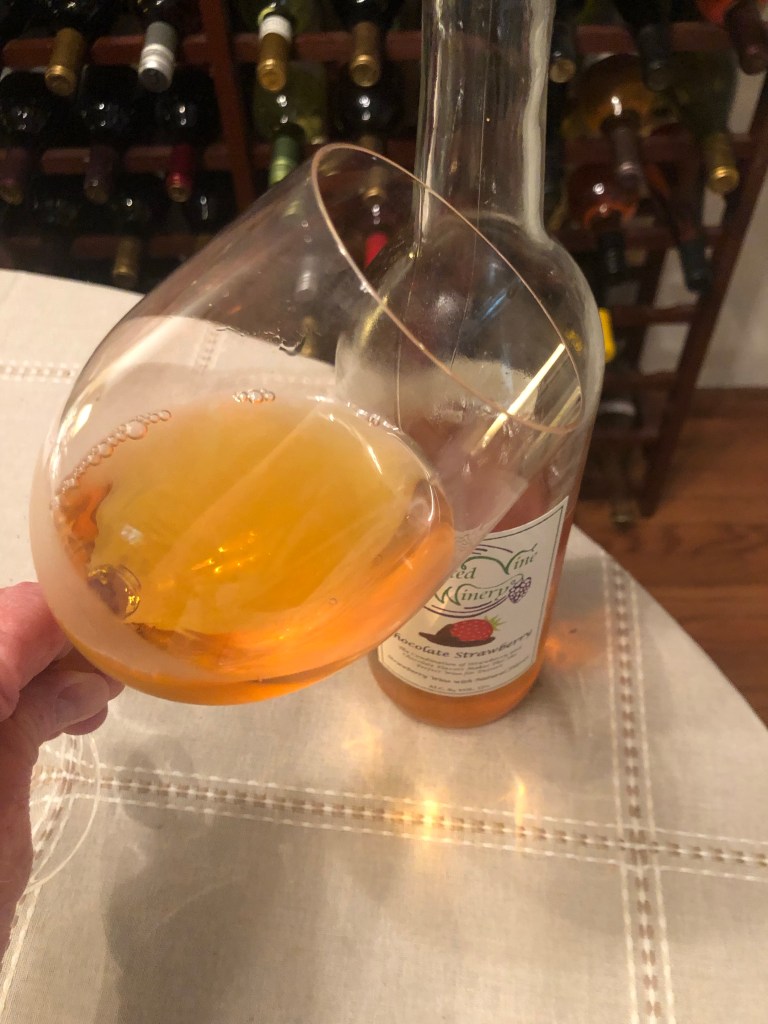 Beautiful color of light orange. it can be difficult to good good color from a real strawberry wine. This on has a very nice color!