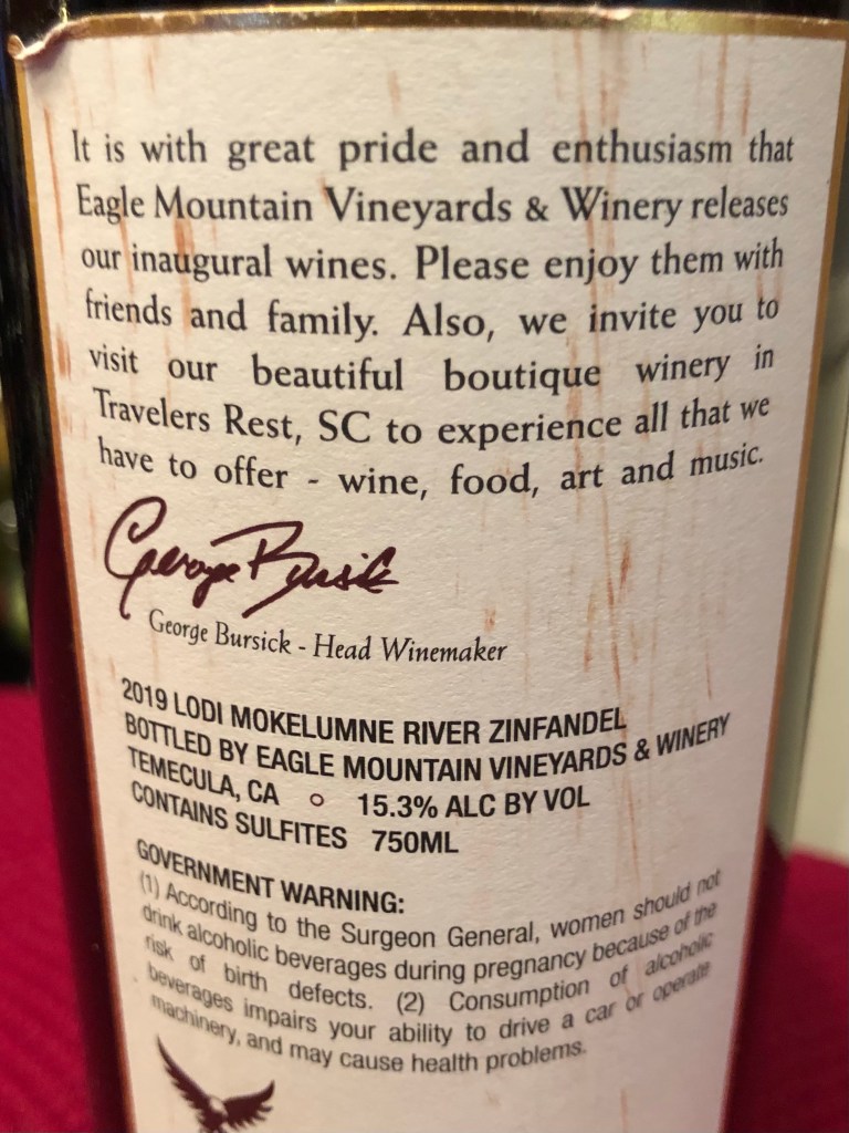 The wine was fermented and bottled in Temecula under the Eagle Mountain label.